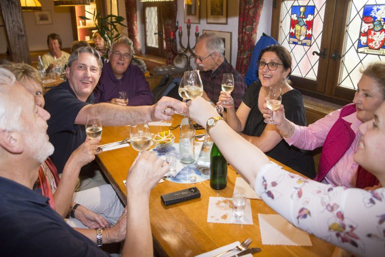 Das Abschiedsessen im Roten Bären beginnt gleichfalls mit einem Glas Sekt im Kellergewölbe des historischen Hotels. An diesem Abend bedanken wir uns herzlich für die reibungslose Organisation und die Vielfalt des Programms und genießen ein letztes Mal die gemeinsame Geselligkeit in der deutsch-französischen Runde.